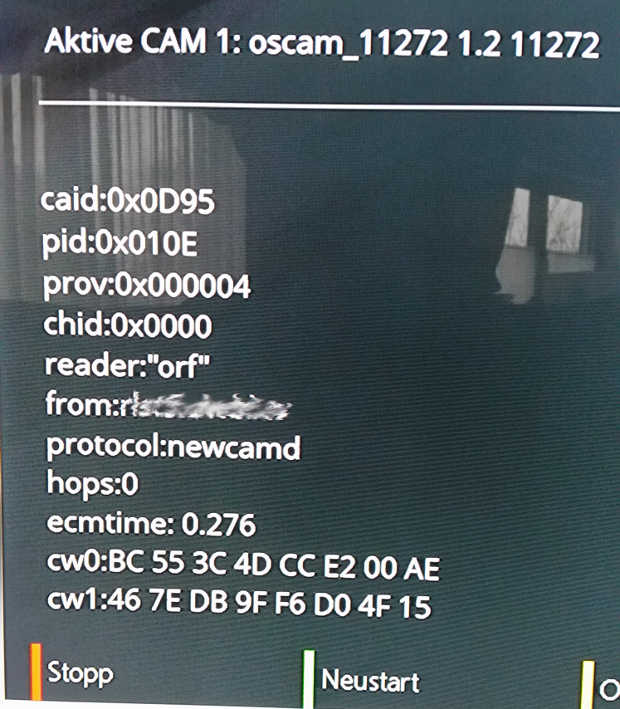 "достаточно одной таблэтки": в oscam.server: [reader] label = "orf" xxxxxxxxx ident = 0D95:000000,000004,000008,00000C,000010 в oscam.dvbapi: xxxxxx P: 0D95:000000 # ORF P: 0D95:000004 # ORF P: 0D95:000008 # ORF P: 0D95:00000C # ORF P: 0D95:000010 # ORF P: 098C:000000 # Sky_De xxxxxx лог при переходе со скай на орф до изменений: Цитата: