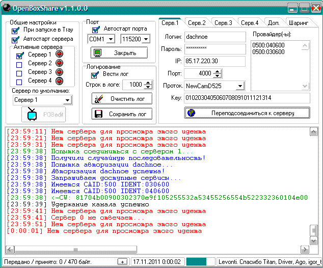 [0:10:20] Попытка соединиться с сервером 1... [0:10:20] Получили случайную последовательность! [0:10:20] Попытка авторизации dachnoe... [0:10:20] Авторизация dachnoe успешна! [0:10:20] Запрашиваем доступные сервисы... [0:10:20] Имеется CAID:500 IDENT:030600 [0:10:20] Имеется CAID:500 IDENT:040600 [0:10:20] <-CW: 81704b00900302370e9f105255532a53455256554b52233236 0104e001c0e2033f7103e2033f7167e2033f7107e2033f7161 ea101137dd0fbec5ee5f233a2ebfbebacc93f008745b8bca79 7a39ee [0:10:21] Удержание канала успешно [0:10:25] Нет сервера для просмотра этого идента [0:10:25] Сервер 0 не отвечает... [0:10:35] Нет сервера для просмотра этого идента [0:10:45] Нет сервера для просмотра этого идента [0:10:55] Нет сервера для просмотра этого идента Ресивер Winquest 3115, до этого был идент 023700, тарелка на 36 градус. прогоамма OpenBoxShare v1.1.0.0. |