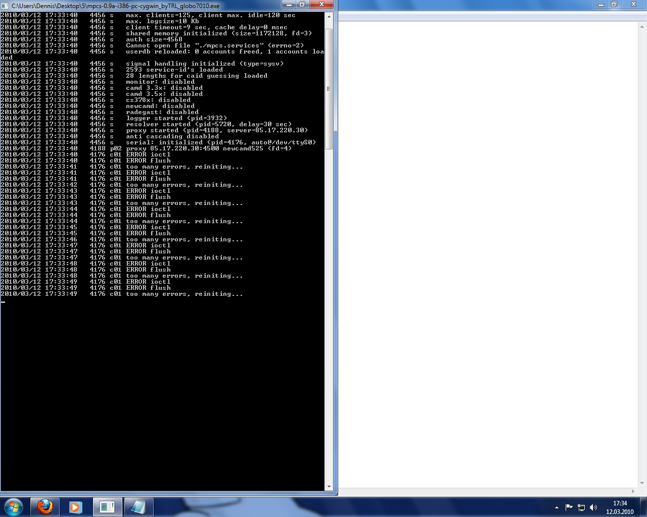 2010/03/07 17:08:47 4232 s >> STREAMBOARD << mp-cardserver started 2010/03/07 17:08:47 4232 s Cannot open file "./mpcs.sid" (errno=2) 2010/03/07 17:08:47 4232 s userdb reloaded: 0 accounts freed, 0 accounts loaded 2010/03/07 17:08:47 4232 s signal handling initialized (type=sysv) 2010/03/07 17:08:47 4232 s 2593 service-id's loaded 2010/03/07 17:08:47 4232 s 26 lengths for caid guessing loaded 2010/03/07 17:08:47 4232 s monitor: disabled 2010/03/07 17:08:47 4232 s camd 3.3x: disabled 2010/03/07 17:08:47 4232 s camd 3.5x: disabled 2010/03/07 17:08:47 4232 s cs378x: initialized (fd=6, port=1) 2010/03/07 17:08:47 4232 s newcamd: disabled 2010/03/07 17:08:47 4232 s radegast: disabled 2010/03/07 17:08:47 4232 s logger started (pid=2496) 2010/03/07 17:08:47 4232 s resolver started (pid=1928, delay=30 sec) 2010/03/07 17:08:47 4232 s proxy started (pid=5960, server=84.19.182.55) 2010/03/07 17:08:47 4232 s proxy started (pid=4944, server=84.19.182.55) 2010/03/07 17:08:47 5960 p02 proxy 84.19.182.55:4003 newcamd525 (fd=4) 2010/03/07 17:08:47 4944 p03 proxy 84.19.182.55:4008 newcamd525 (fd=4) 2010/03/07 17:08:47 4232 s proxy started (pid=4368, server=84.19.182.55) 2010/03/07 17:08:47 4368 p04 proxy 84.19.182.55:4015 newcamd525 (fd=4) 2010/03/07 17:08:47 4232 s proxy started (pid=2528, server=84.19.182.55) 2010/03/07 17:08:47 4232 s anti cascading disabled 2010/03/07 17:08:47 4232 s serial: initialized (pid=4820, auto@/dev/ttyS0) 2010/03/07 17:08:47 2528 p05 proxy 84.19.182.55:4500 newcamd525 (fd=4) помогите разобраться пожалуйста...
