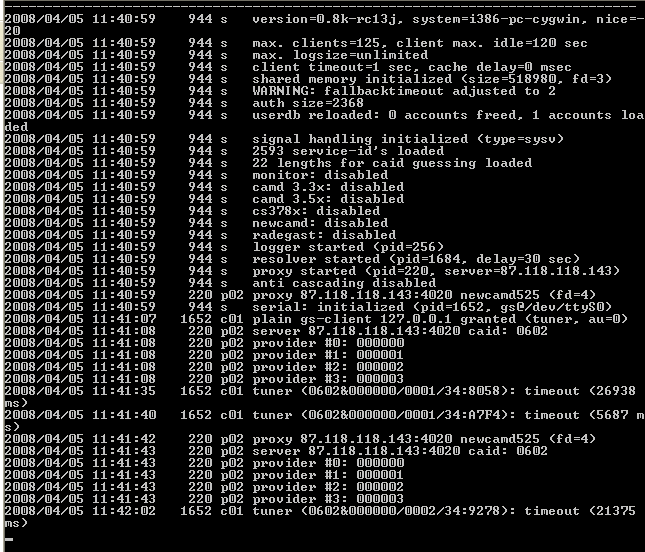2010/01/18 11:05:57 4068 s >> STREAMBOARD << mp-cardserver started 2010/01/18 11:05:57 4068 s auth size=2368 2010/01/18 11:05:57 4068 s userdb reloaded: 0 accounts freed, 1 accounts loa ded 2010/01/18 11:05:57 4068 s signal handling initialized (type=sysv) 2010/01/18 11:05:57 4068 s 2593 service-id's loaded 2010/01/18 11:05:57 4068 s 22 lengths for caid guessing loaded 2010/01/18 11:05:57 4068 s monitor: disabled 2010/01/18 11:05:57 4068 s camd 3.3x: disabled 2010/01/18 11:05:57 4068 s camd 3.5x: disabled 2010/01/18 11:05:57 4068 s cs378x: disabled 2010/01/18 11:05:57 4068 s newcamd: disabled 2010/01/18 11:05:57 4068 s radegast: disabled 2010/01/18 11:05:57 4068 s logger started (pid=432) 2010/01/18 11:05:57 4068 s resolver started (pid=2260, delay=30 sec) 2010/01/18 11:05:57 4068 s proxy started (pid=2840, server=213.155.7.144) 2010/01/18 11:05:57 4068 s anti cascading disabled 2010/01/18 11:05:57 2840 p02 proxy 213.155.7.144:4000 newcamd525 (fd=4) 2010/01/18 11:05:57 4068 s serial: initialized (pid=828, gi@/dev/ttyS0) 2010/01/18 11:05:58 828 c01 plain gi-client 127.0.0.1 granted (tuner, au=0) 2010/01/18 11:06:00 2840 p02 server 213.155.7.144:4000 caid: 0500 2010/01/18 11:06:00 2840 p02 provider #0: 023700 2010/01/18 11:06:00 2840 p02 provider #1: 030600 2010/01/18 11:06:00 828 c01 tuner (0500&023700/0000/4A:4016): found (2235 ms) by 36+ 2010/01/18 11:06:05 828 c01 tuner (0500&023700/0000/4A:4016): cache1 (0 ms) 2010/01/18 11:06:06 828 c01 tuner (0500&023700/0000/4A:4017): found (453 ms) by 36+ 2010/01/18 11:06:15 828 c01 tuner (0500&023700/0000/4A:4017): cache1 (0 ms) 2010/01/18 11:06:16 828 c01 tuner (0500&023700/0000/4A:4016): found (641 ms) by 36+ 2010/01/18 11:06:25 828 c01 tuner (0500&023700/0000/4A:4016): cache1 (0 ms) 2010/01/18 11:06:26 828 c01 tuner (0500&023700/0000/4A:4017): found (859 ms) by 36+ 2010/01/18 11:06:35 828 c01 tuner (0500&023700/0000/4A:4017): cache1 (0 ms) 2010/01/18 11:06:36 828 c01 tuner (0500&023700/0000/4A:4016): found (781 ms) by 36+ 2010/01/18 11:06:51 828 c01 tuner (0500&023700/0000/4A:4017): timeout (5063 m s) 2010/01/18 11:07:01 828 c01 tuner (0500&023700/0000/4A:4016): timeout (5062 m s) 2010/01/18 11:07:10 828 c01 tuner (0500&023700/0000/4A:4016): timeout (5063 m s) 2010/01/18 11:07:16 828 c01 tuner (0500&023700/0000/4A:4017): timeout (5078 m s) 2010/01/18 11:07:21 828 c01 tuner (0500&023700/0000/4A:4016): timeout (5062 m s) 2010/01/18 11:07:31 828 c01 tuner (0500&023700/0000/4A:4016): timeout (5063 m s) 2010/01/18 11:07:36 828 c01 tuner (0500&023700/0000/4A:4017): timeout (5062 m s) 2010/01/18 11:07:41 828 c01 tuner (0500&023700/0000/4A:4016): timeout (5016 m s) 2010/01/18 11:07:43 2840 p02 proxy 213.155.7.144:4000 newcamd525 (fd=4) 2010/01/18 11:07:43 2840 p02 connect(fd=4) failed: (errno=118) 2010/01/18 11:07:43 2840 p02 proxy 213.155.7.144:4000 newcamd525 (fd=4) 2010/01/18 11:07:43 2840 p02 connect(fd=4) failed: (errno=118) 2010/01/18 11:07:43 2840 p02 proxy 213.155.7.144:4000 newcamd525 (fd=4) 2010/01/18 11:07:43 2840 p02 connect(fd=4) failed: (errno=118) 2010/01/18 11:07:43 2840 p02 proxy 213.155.7.144:4000 newcamd525 (fd=4) 2010/01/18 11:07:43 2840 p02 connect(fd=4) failed: (errno=118) 2010/01/18 11:07:43 2840 p02 proxy 213.155.7.144:4000 newcamd525 (fd=4) 2010/01/18 11:07:43 2840 p02 connect(fd=4) failed: (errno=118) 2010/01/18 11:07:43 2840 p02 proxy 213.155.7.144:4000 newcamd525 (fd=4) 2010/01/18 11:07:43 2840 p02 connect(fd=4) failed: (errno=118) 2010/01/18 11:07:43 2840 p02 proxy 213.155.7.144:4000 newcamd525 (fd=4) 2010/01/18 11:07:43 2840 p02 connect(fd=4) failed: (errno=118) 2010/01/18 11:07:43 2840 p02 proxy 213.155.7.144:4000 newcamd525 (fd=4) 2010/01/18 11:07:43 2840 p02 connect(fd=4) failed: (errno=118) 2010/01/18 11:07:43 2840 p02 proxy 213.155.7.144:4000 newcamd525 (fd=4) 2010/01/18 11:07:43 2840 p02 connect(fd=4) failed: (errno=118) 2010/01/18 11:07:43 2840 p02 proxy 213.155.7.144:4000 newcamd525 (fd=4) 2010/01/18 11:07:43 2840 p02 connect(fd=4) failed: (errno=118) 2010/01/18 11:07:43 2840 p02 proxy 213.155.7.144:4000 newcamd525 (fd=4) 2010/01/18 11:07:43 2840 p02 connect(fd=4) failed: (errno=118) 2010/01/18 11:07:43 2840 p02 proxy 213.155.7.144:4000 newcamd525 (fd=4) 2010/01/18 11:07:43 2840 p02 connect(fd=4) failed: (errno=118) 2010/01/18 11:07:43 2840 p02 proxy 213.155.7.144:4000 newcamd525 (fd=4) 2010/01/18 11:07:43 2840 p02 connect(fd=4) failed: (errno=118) 2010/01/18 11:07:46 2840 p02 proxy 213.155.7.144:4000 newcamd525 (fd=4) 2010/01/18 11:07:46 2840 p02 connect(fd=4) failed: (errno=118) 2010/01/18 11:07:48 2840 p02 proxy 213.155.7.144:4000 newcamd525 (fd=4) 2010/01/18 11:07:48 2840 p02 connect(fd=4) failed: (errno=118) 2010/01/18 11:07:51 828 c01 tuner (0500&023700/0000/4A:4017): timeout (5063 m s) 2010/01/18 11:07:56 2840 p02 proxy 213.155.7.144:4000 newcamd525 (fd=4) 2010/01/18 11:07:56 2840 p02 connect(fd=4) failed: (errno=118) 2010/01/18 11:07:58 2840 p02 proxy 213.155.7.144:4000 newcamd525 (fd=4) 2010/01/18 11:07:58 2840 p02 connect(fd=4) failed: (errno=118) 2010/01/18 11:08:01 828 c01 tuner (0500&023700/0000/4A:4016): timeout (5062 m s) 2010/01/18 11:08:06 2840 p02 proxy 213.155.7.144:4000 newcamd525 (fd=4) 2010/01/18 11:08:06 2840 p02 connect(fd=4) failed: (errno=118) 2010/01/18 11:08:08 2840 p02 proxy 213.155.7.144:4000 newcamd525 (fd=4) 2010/01/18 11:08:08 2840 p02 connect(fd=4) failed: (errno=118) 2010/01/18 11:08:11 828 c01 tuner (0500&023700/0000/4A:4017): timeout (5062 m s) Здесь включаю ADSL 2010/01/18 11:08:16 2840 p02 proxy 213.155.7.144:4000 newcamd525 (fd=4) 2010/01/18 11:08:16 2840 p02 server 213.155.7.144:4000 caid: 0500 2010/01/18 11:08:16 2840 p02 provider #0: 023700 2010/01/18 11:08:16 2840 p02 provider #1: 030600 2010/01/18 11:08:18 828 c01 tuner (0500&023700/0000/4A:4016): found (2250 ms) by 36+ 2010/01/18 11:08:26 828 c01 tuner (0500&023700/0000/4A:4016): cache1 (0 ms) 2010/01/18 11:08:26 828 c01 tuner (0500&023700/0000/4A:4017): found (187 ms) by 36+ 2010/01/18 11:08:36 828 c01 tun