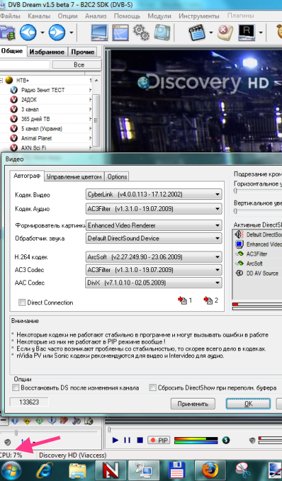 добился я и на семерке качественной картинки как ШД так и обычных каналов, и загрузка ЦП при этом какая))) прилагаю скрин